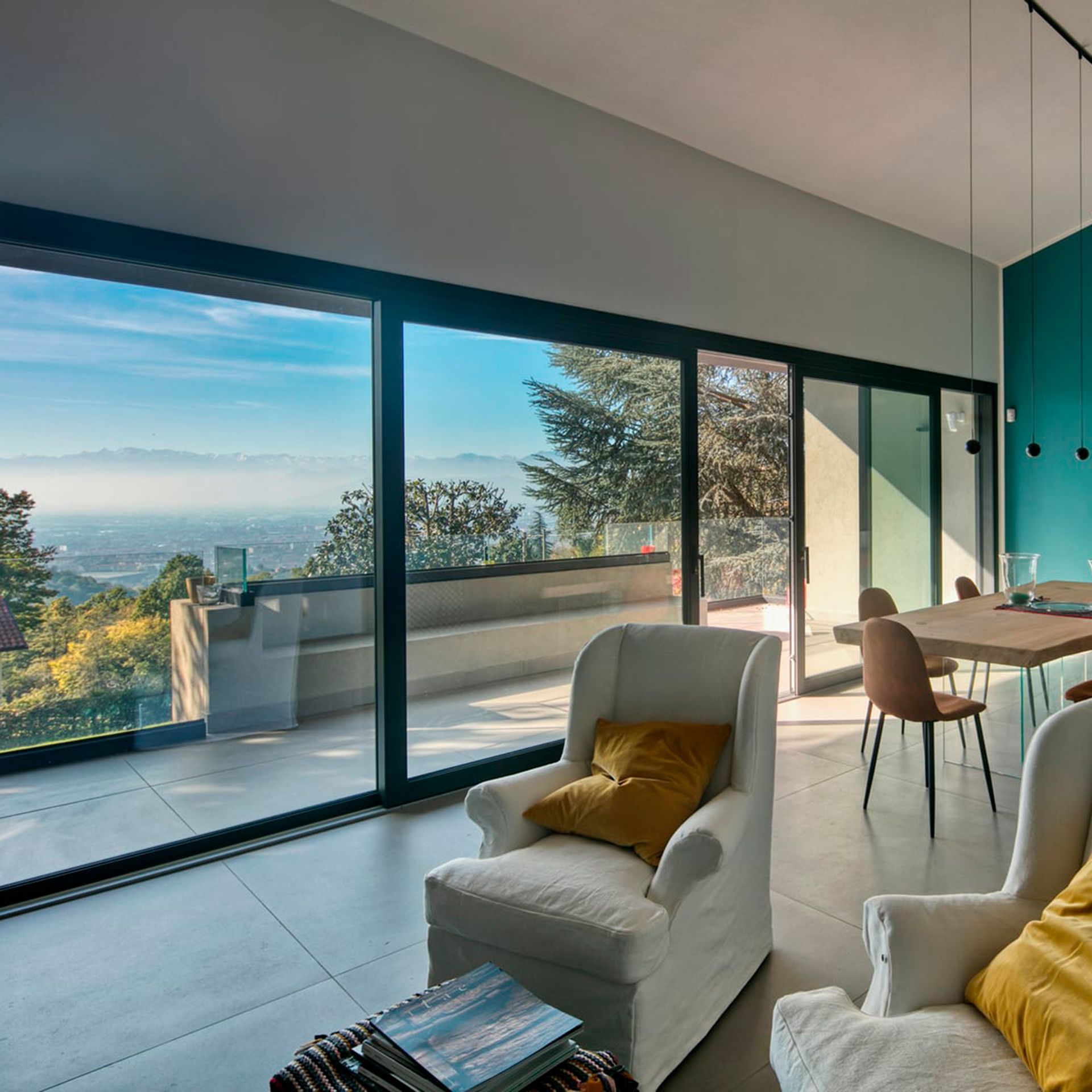 De grandes ouvertures pour un habitat accessible. A l’ouverture la partie mobile du système FIN-Slide se soulève légèrement, à la fermeture il s’abaisse et se remet au contact du seuil. Ce mécanisme permet de réaliser des portes-fenêtres avec des seuils à la fois très plats et extrêmement étanches. Disponible dans un grand choix de matériaux et de variantes, ce modèle permet par ailleurs des ouvrants de dimensions particulièrement importantes, mais toujours très faciles à manœuvrer. Trois possibilités de manœuvre. L’ouvrant de la porte levante-coulissante est extrêmement facile à manœuvrer grâce à un guidage par rouleaux de haute qualité. L’option Soft-Stop permet de freiner le vantail dans sa course avant d’atteindre sa position de fermeture. En plus de la manœuvre manuelle, Finstral propose une version motorisée, compatible avec les systèmes de domotique Smart Home.